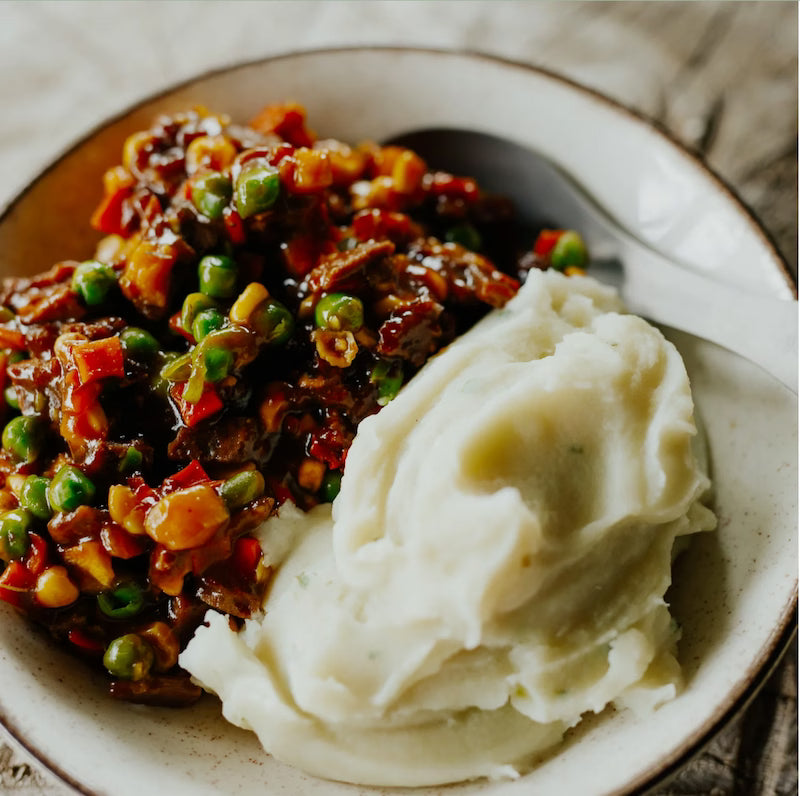 Mashed Potato (Potato Flakes (Potato, Emulsifier (471), Antioxidant (Citric Acid), Preservative (223) (Sulphites)), Milk Powder (Contains Milk, Emulsifier (Soy Lecithin)), Canola Oil, Salt, Sugar, Chives), Beef Dices (24%) (Beef, Salt, Mineral Salt (451, 450)), Sauce (Thickeners (1422, Xanthan Gum), Milk Powder, Sugar, Soy Sauce (Soybeans, Rice, Salt, Maltodextrin, Rice Bran Oil), Flavour (Soy), Yeast Extract, Vegetables, Colour (Caramel I), Herbs (Gluten) & Spices, Vegetable Gum (Guar Gum)), Peas (Peas, Acidity Regulator (331, Sodium Bicarbonate)), Corn, Carrot (Contains Acidity Regulator (Sodium Bicarbonate)), Pumpkin.