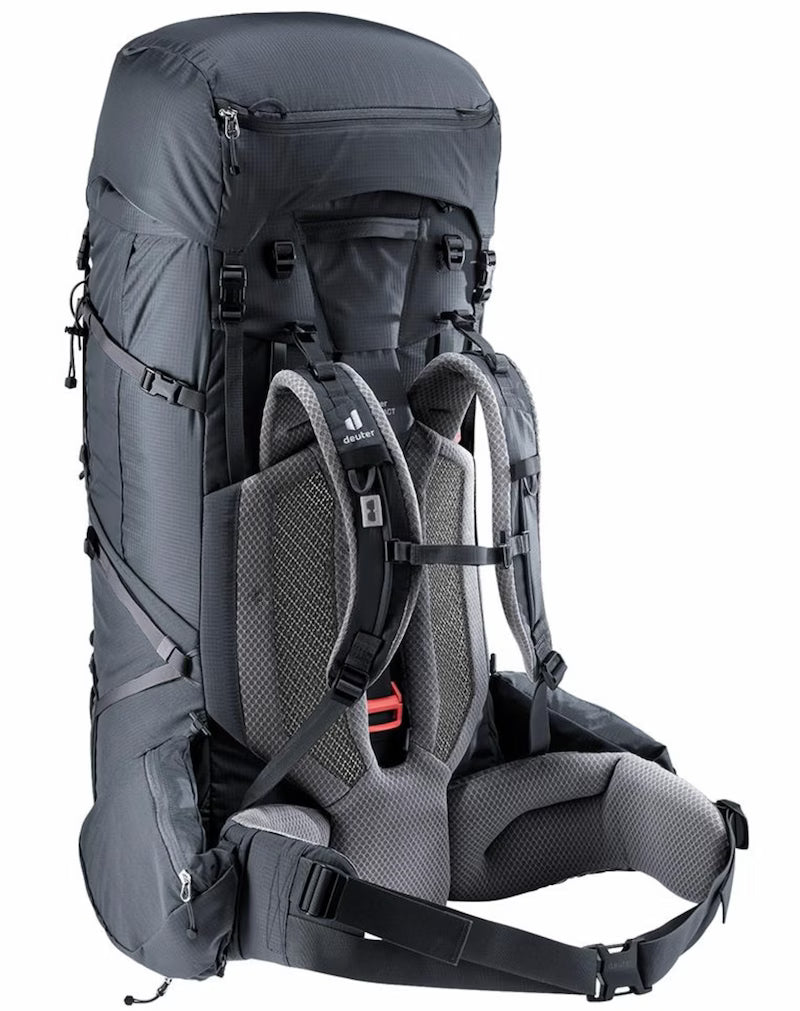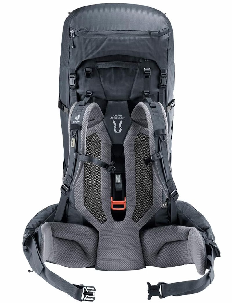 The lid also detaches and doubles as a day pack to give it added adaptability. The deuter Aircontact back system with VariSlide length adjustment, plus wrapping VariFlex hip fins, and pivoting ActiveFit shoulder straps create a tailored fit. Add the stabilizing Y-shaped aluminum frame and lumbar pad with breathable Air Spacer mesh give it outstanding carrying comfort.