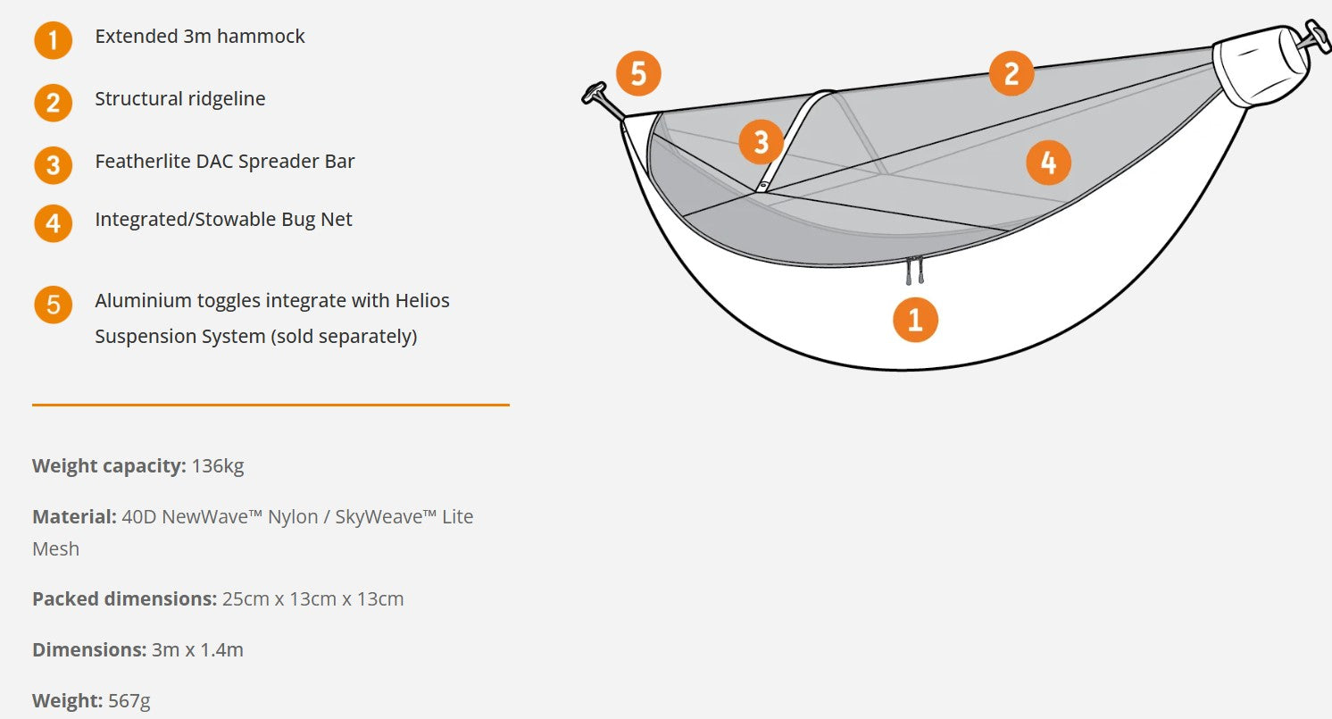 Extended 10-foot long hammock body creates extra room to spread out and find your comfort zone laying flat or either diagonal direction. A structural ridgeline and lightweight DAC spreader bar creates a tent-like canopy and more space to spread out.