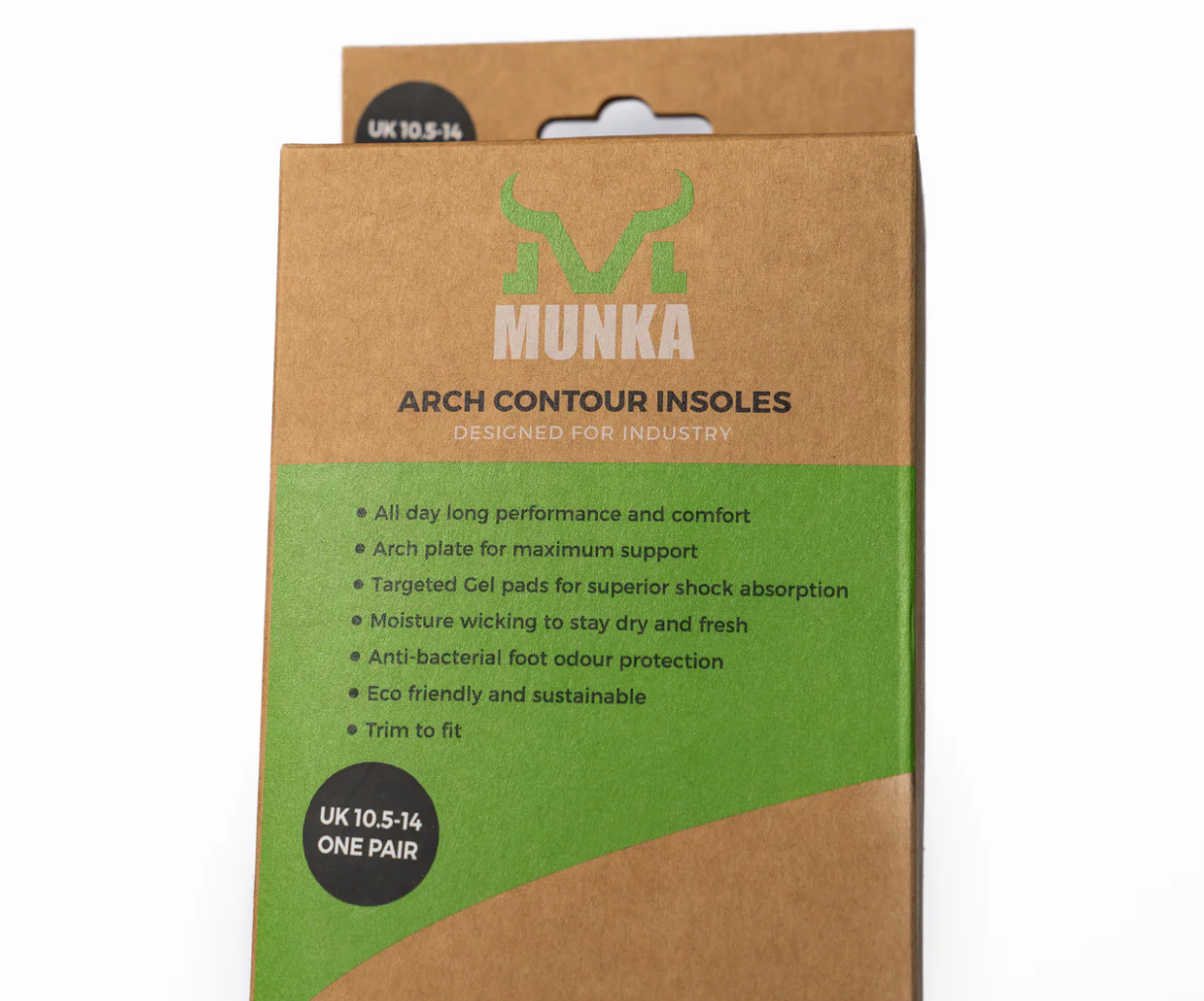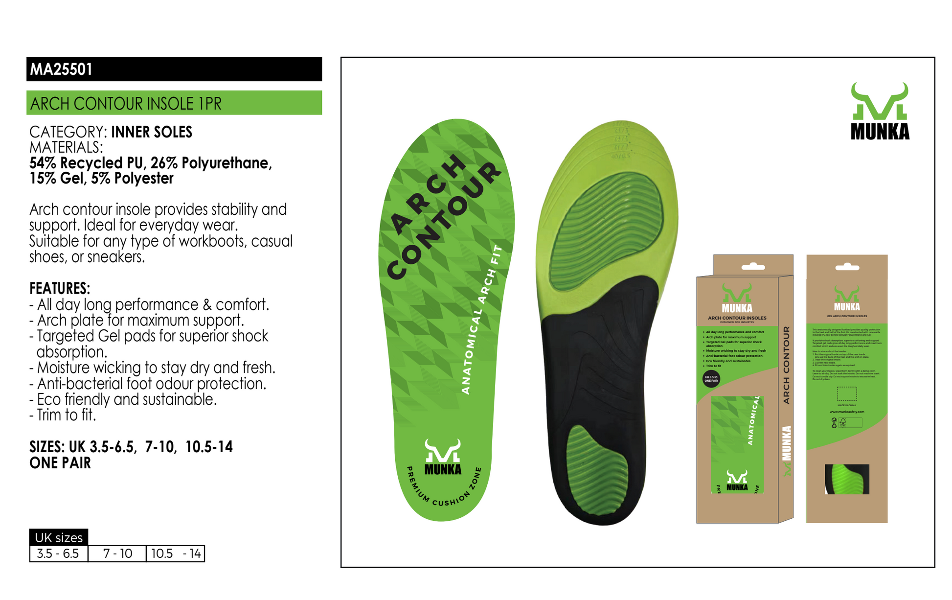 The Munka Arch Contour Insole is composed of 54% recycled PU, 26% polyurethane, 15% gel, and 5% polyester, offering exceptional stability and support. This insole is versatile and can be used in various types of footwear, including workboots, casual shoes, or sneakers. It meets the Australian Standard AS 2210.3:2019 and provides all-day performance and comfort. With an arch plate for maximum support and targeted Gel pads for superior shock absorption, this insole also features moisture-wicking material to keep your feet dry and fresh. Plus, it offers anti-bacterial protection against foot odour. Trim to fit for optimal fit and enjoy the eco-friendly and sustainable design.