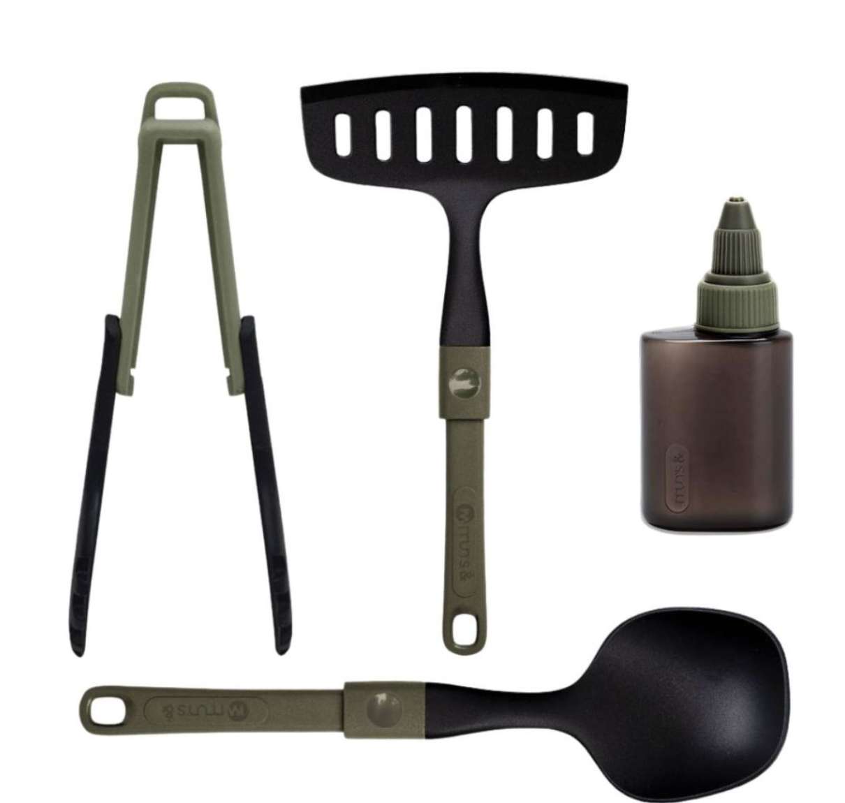 The set includes a ladle, spatula, tongs, and a 50ml squeeze bottle—ideal for storing cooking oils or sauces. Two mesh storage bags keep everything organised and easy to pack away. Whether you’re flipping, stirring, serving, or drizzling, this kit makes cooking by the campfire simple and enjoyable.