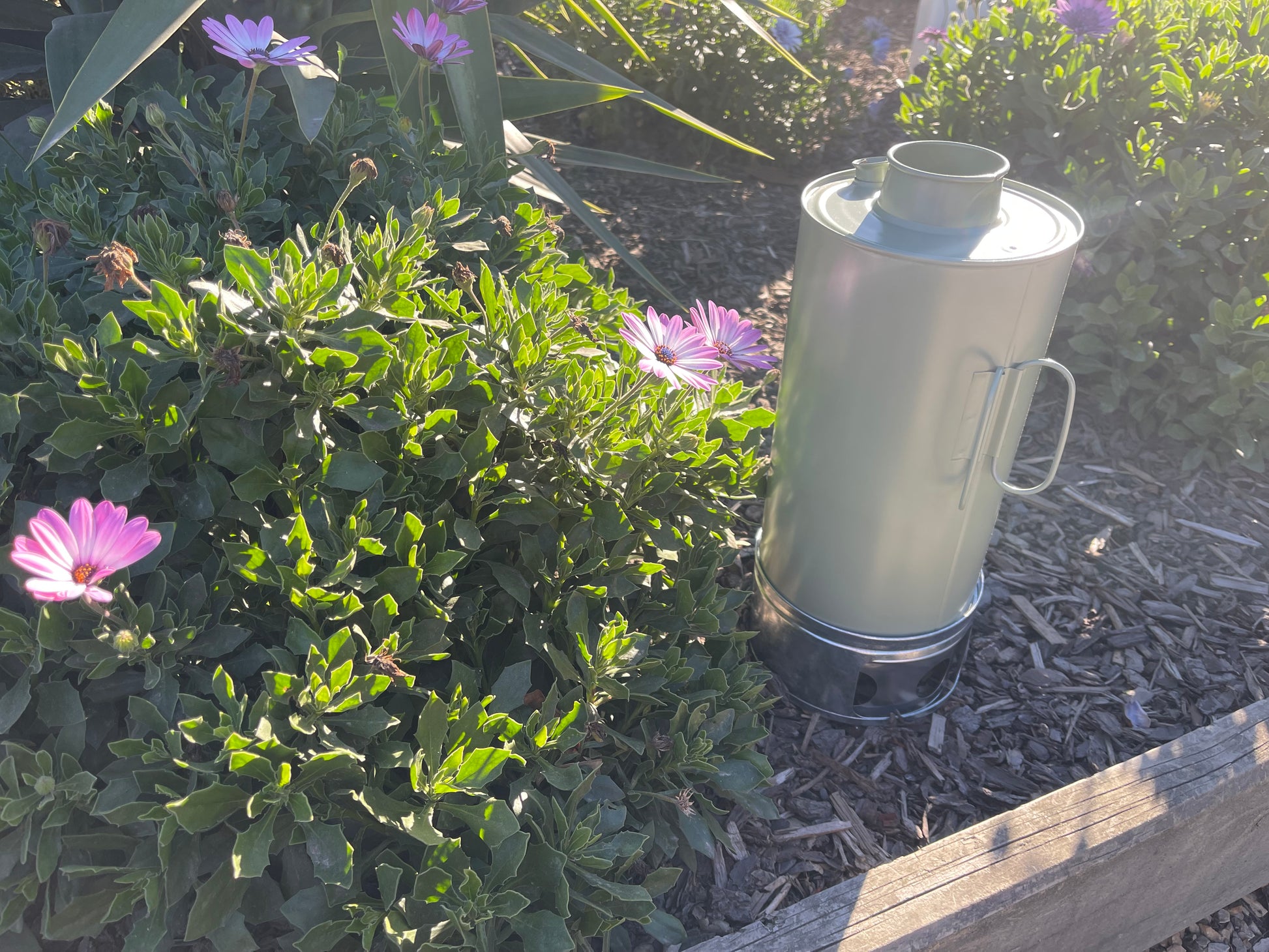 Thermette’s unique Kiwi design has a cone shaped cylinder to hold water that heats up to boiling point very quickly. From a small fire at its base, heat is distributed fast to all the surfaces that surrounds the water. Then the heat generated funnels out the top of the cylinder chimney. Add the stainless cooking ring and you have a mini stove top.
