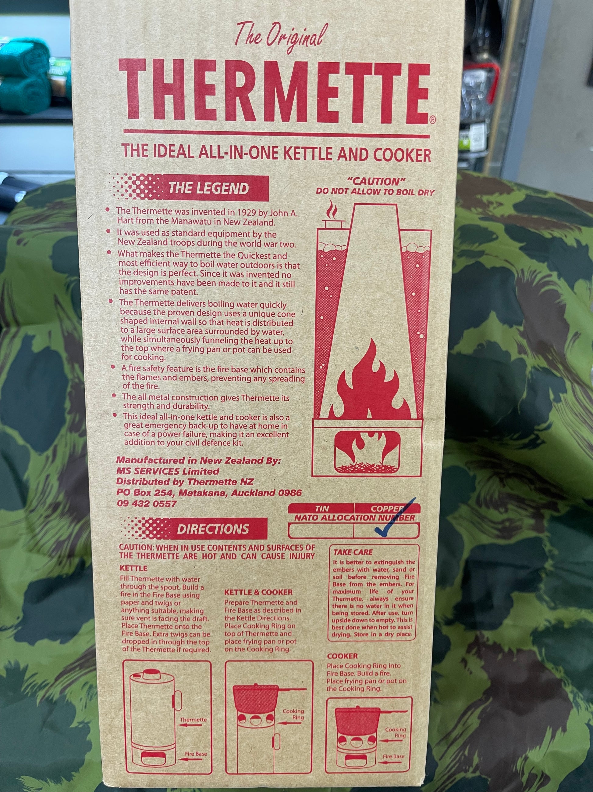 During the Second World War, the Thermette provided a quick and easy way to boil water and cook outdoors in the desert. During this era a New Zealand made Thermette was considered a vital piece of equipment for NZ Army Soldiers. During this time of war the Thermette acquired the nick name of ‘Benghazi Boiler’. Today the Thermette continues to be used by the New Zealand Defence Forces in training and exercise programmes.