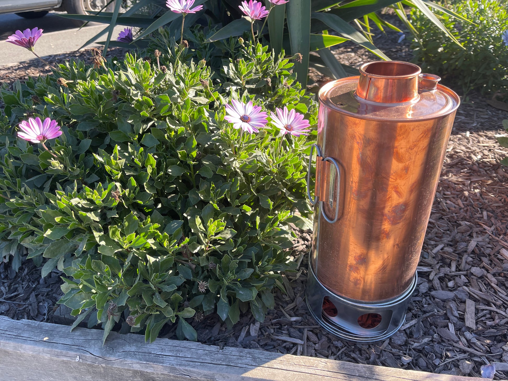 The New Zealand made and designed Copper Thermette Boils 12 cups of water in five minutes, all you need is some small twigs and matches or a lighter.